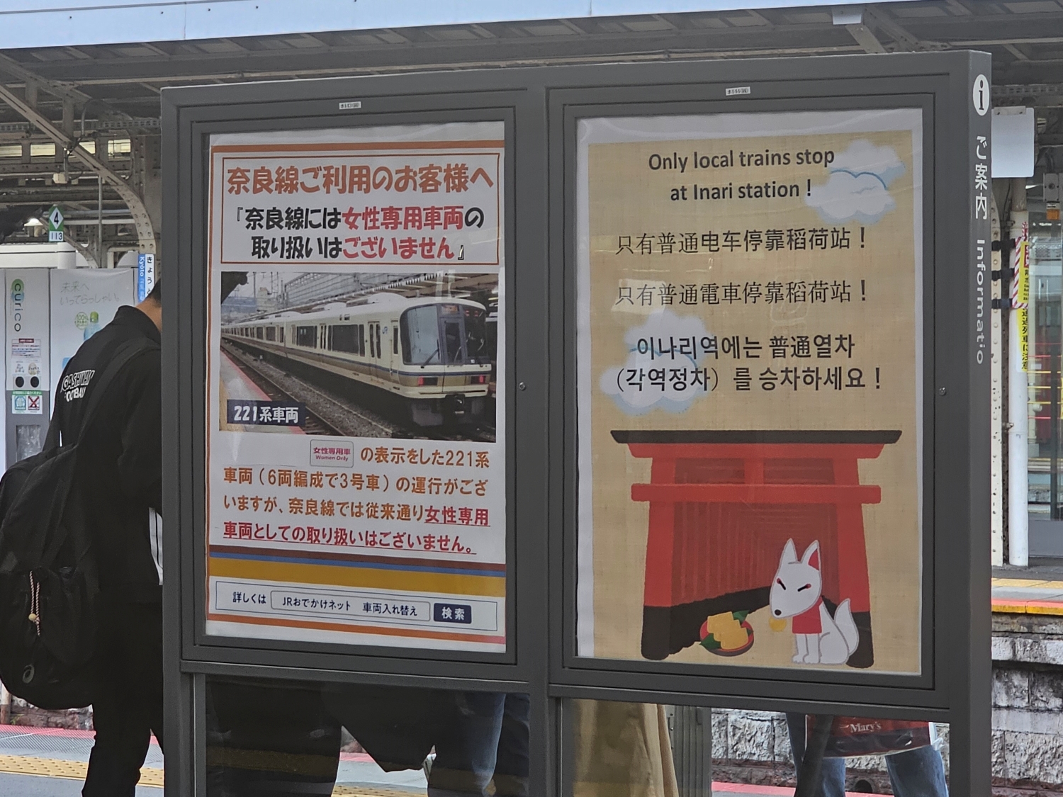 JR나라선은 일본의 많은 열차 노선이 그러하듯 모든 역에 정차하는 보통열차, 우리나라의 급행과 비슷한 특급 열차 등으로 나뉘는데 후시미 이나리 신사에는 급행열차가 멈추지 않기 때문에 무조건 보통 열차에 탑승해야 한다.
